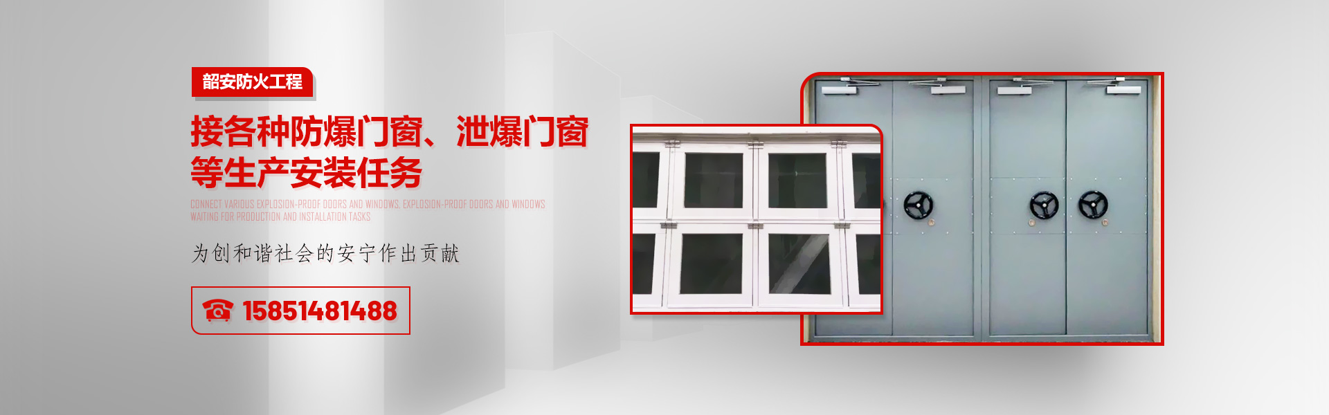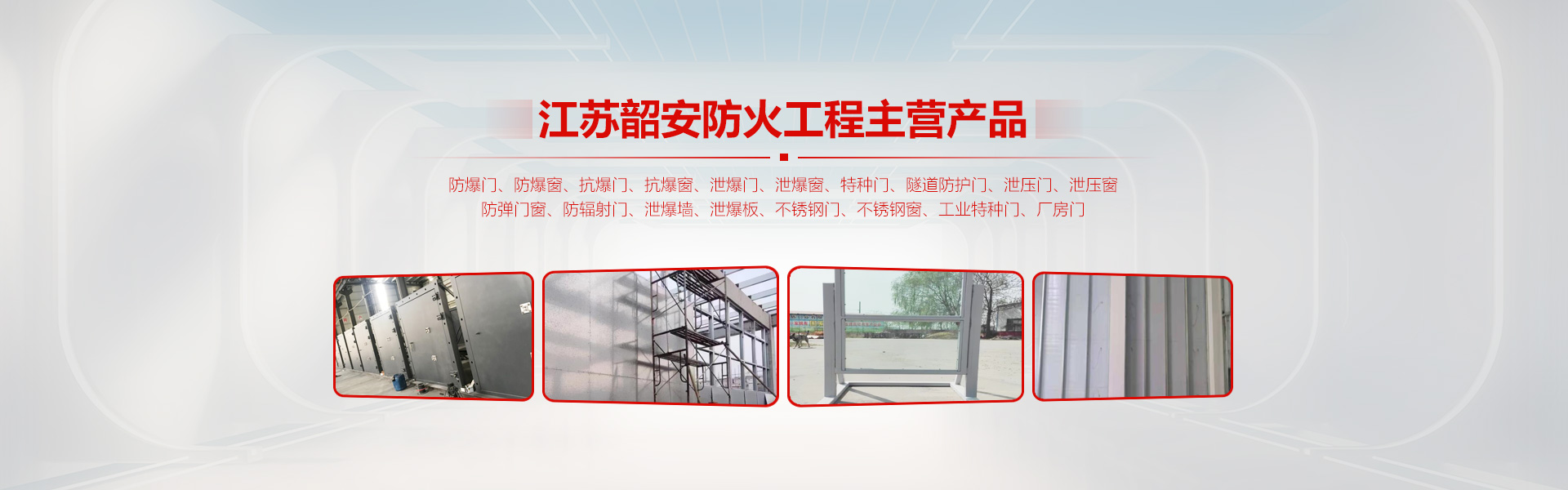 江苏韶安防火工程有限公司产品主要有:防爆门、防爆窗、抗爆门、抗爆窗、泄爆门、泄爆窗、特种门、隧道防护门、泄压门、泄压窗、防弹门窗、防辐射门、泄爆墙、泄爆板、不锈钢门、不锈钢窗、工业特种门、厂房门等系列产品的企业。公司有能力承接各种防爆门窗、泄爆门窗等生产安装任务。